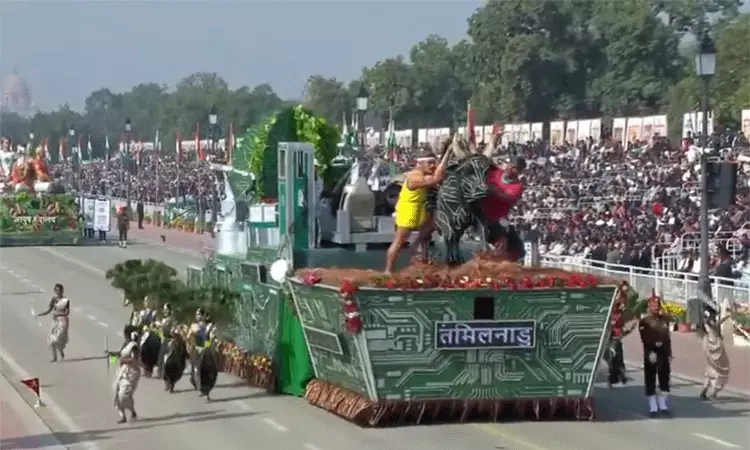 77-வது குடியரசு தின விழாவையொட்டி டெல்லி கடமைப் பாதையில் ஜனாதிபதி திரவுபதி முர்மு தேசிய கொடியை ஏற்றினார். அப்போது, இந்தியாவின் படை வலிமை, பன்முக கலாசாரத்தை பிரதிபலிக்கும் வகையில் அணிவகுப்பு நடந்தது. இந்த அணிவகுப்பில் தமிழக அரசின் வாகனம் அணிவகுத்தது. தமிழக அரசின் வாகனத்தில் ஜல்லிக்கட்டு காளையை மாடுபிடி வீரர்கள் அடக்குவது போன்ற முகப்பு காட்சி வடிவமைக்கப்பட்டிருந்தது.