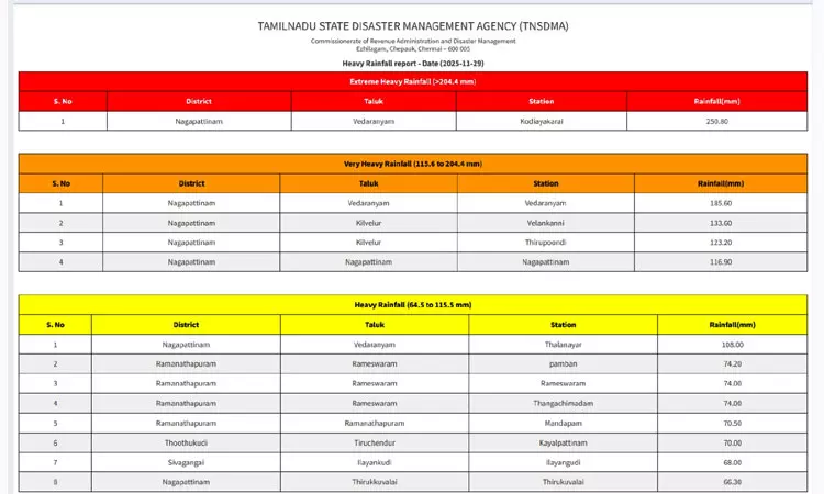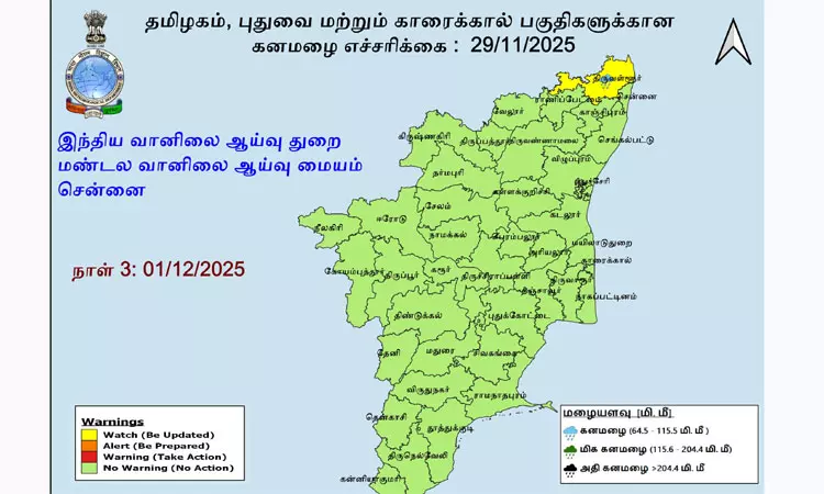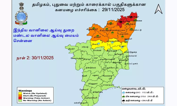 செங்கல்பட்டு, விழுப்புரம், கடலூர், மயிலாடுதுறை, நாகை, புதுச்சேரி மற்றும் காரைக்கால் பகுதிகளுக்கு இன்று (நவ.29) அதி கனமழைக்கான ரெட் அலர்ட் விடுக்கப்பட்டுள்ளது.